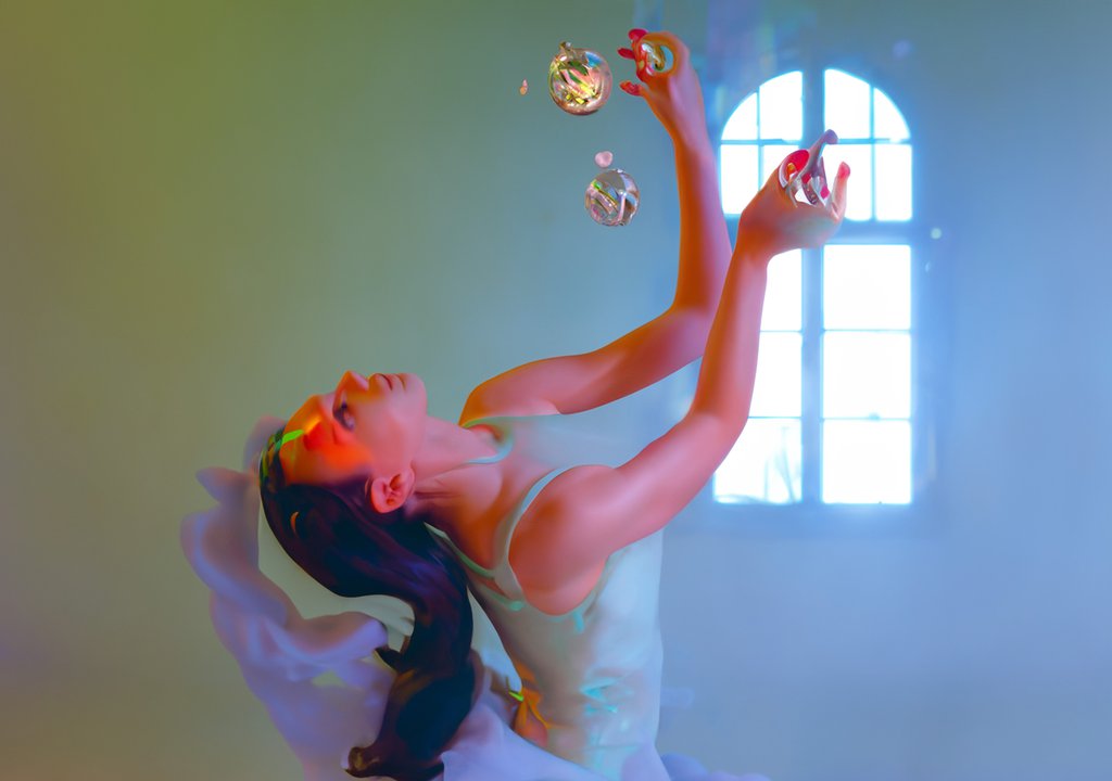 Auch das Titelbild von »Galatea Upload« entstand mithilfe des KI-Generators Adobe Firefly. Das Ausgangsbild von Tänzerin Sara Ezzell wurde durch Wiederholungen eines prompts, also einer Anweisung an die KI, immer weiter verfremdet und neu zusammengesetzt. Aus den Ergebnissen wurde das Titelbild (s.o.) ausgewählt.